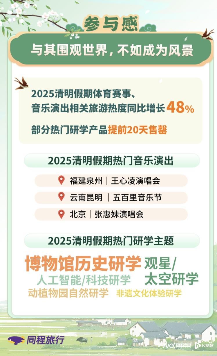 参与感也是大众旅游人群关注的旅行要素。同程旅行数据显示,2025年清明假期,国内体育赛事、音乐演出相关旅游搜索热度同比激增48%,部分热门研学产品提前20天售罄,折射出游客从“被动观景”向“主动共创”的消费转向。