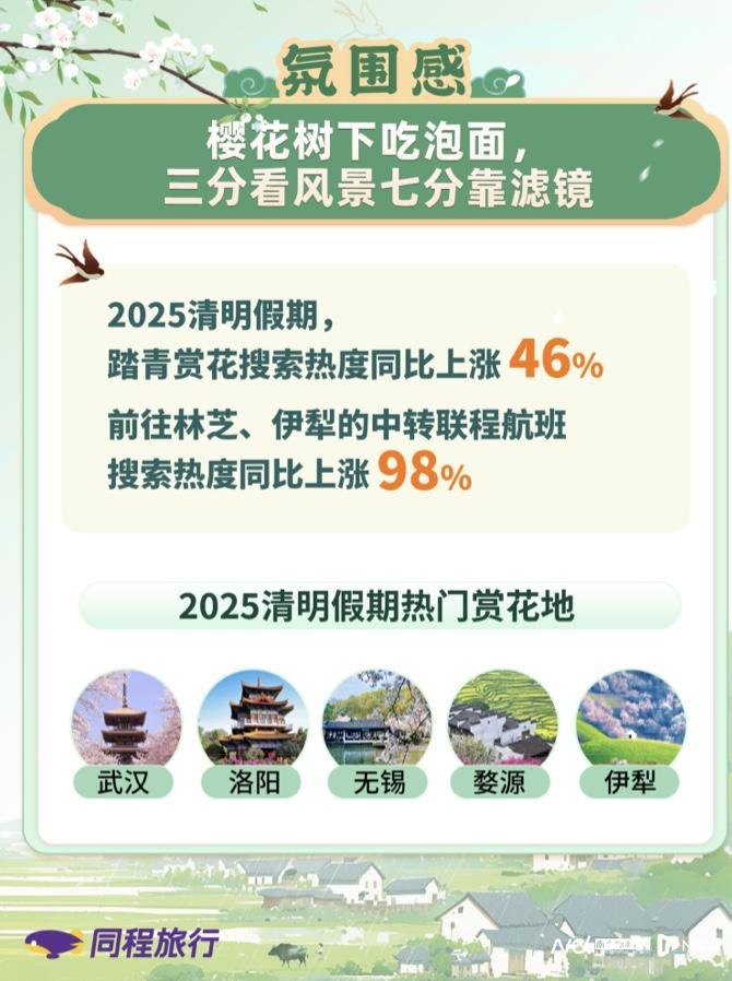 2025年清明假期,追求氛围感的赏花踏青成为出游市场的一大亮点。数据显示,“踏青赏花”相关主题词的搜索热度同比上涨46%,折射出游客对沉浸式春景体验的旺盛需求。武汉东湖樱园、洛阳的牡丹花会、无锡鼋头渚樱花谷等传统赏花地持续领跑热度榜。伊犁的杏花和林芝的桃花则吸引了大量中长线游客拼假前往,同程旅行数据显示,各地前往伊犁和林芝的中转联程航班搜索热度同比上涨98%。
