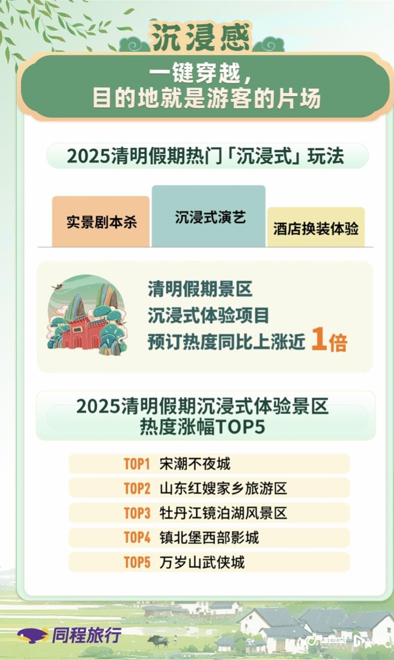 2024年年底,山东“红嫂”家乡“跟着团长打县城”和牡丹江镜泊湖景区“流放宁古塔”探秘路线相继爆火。年轻游客通过角色代入、场景交互与情感共振,短暂脱离日常生活中的身份,沉浸在特定故事情境中。报告显示,2025年清明假期,景区沉浸式体验项目预订热度同比上涨近1倍。沉浸式演艺、实景剧本杀和酒店换装体验,都是游客喜爱的沉浸式旅游玩法。同程旅行平台上,宋潮不夜城、山东红嫂家乡旅游区、牡丹江镜泊湖景区、镇北堡西部影城、万岁山武侠城等热门沉浸式体验类景区清明假期热度同比涨幅均超过2倍。