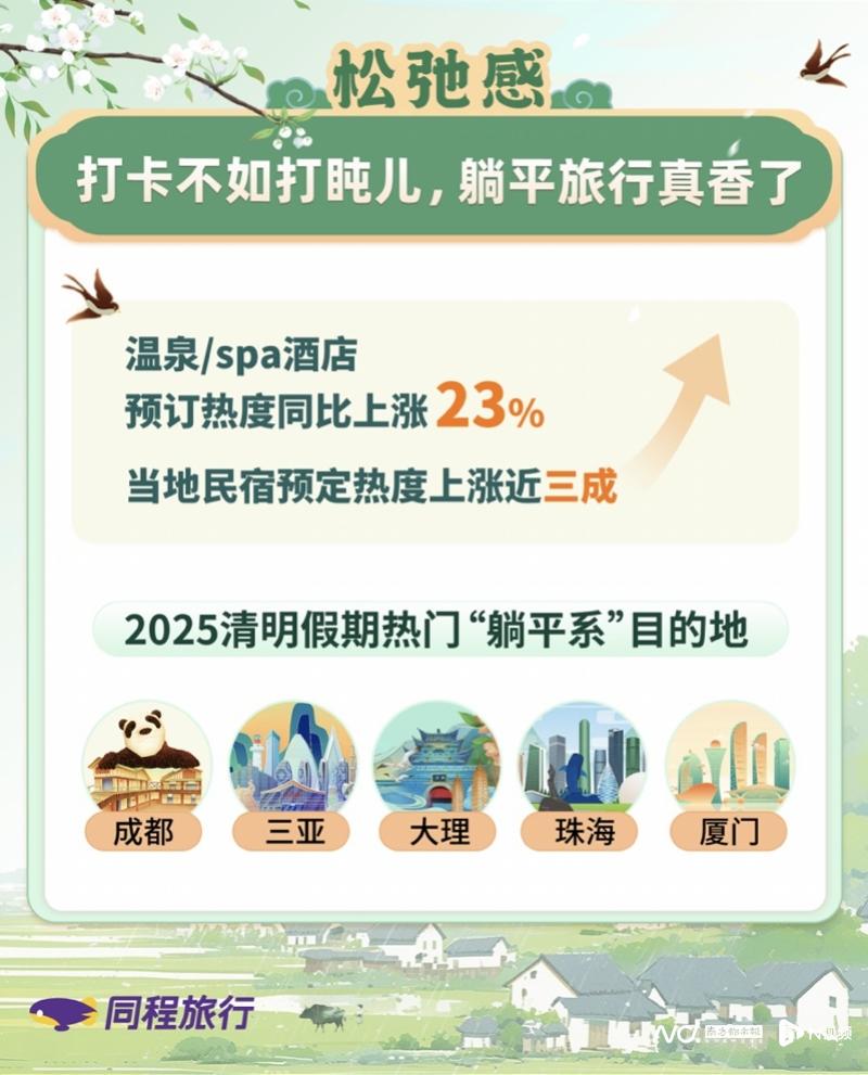随着大众旅游需求更加多元,旅游市场迎来“反特种兵”式消费风向。以慢节奏、疗愈向为特点的“躺平式旅行”取代高强度打卡,成为游客释放压力的新选择。同程旅行数据显示,2025清明假期温泉/SPA类酒店预订热度同比上涨23%。城市居民对本地民宿的预订热度增长近三成,成都、三亚、大理、珠海、厦门等目的地热度居前。其中,三亚各大高端度假酒店推出“海岛冥想”“落日瑜伽”等疗愈项目,将“泡酒店”转化为身心放松的完整闭环;大理洱海民宿集群推出扎染体验、围炉煮茶等在地化服务,构建“住下来即是旅行”的沉浸式休闲场景;珠海情侣路沿线“骑行驿站”、厦门鼓浪屿“音乐慢闪店”等业态,则通过“无目的漫游”强化松弛感标签,吸引年轻游客前往。