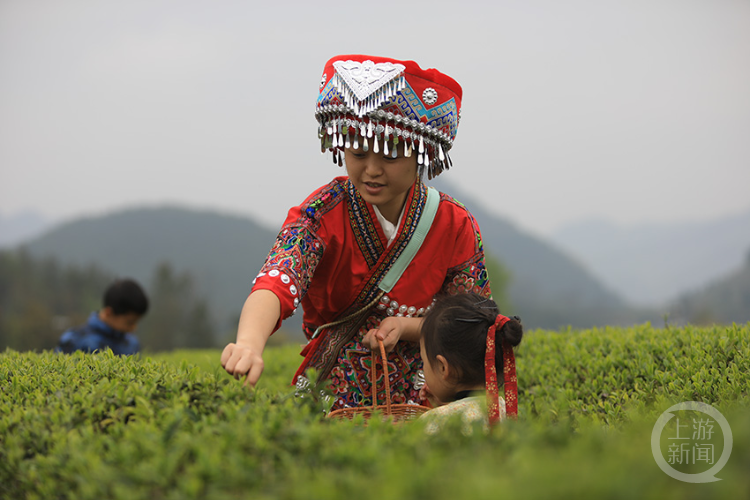 一位身着民族服饰的游客在秀山土家族苗族自治县峨溶镇大坪茶园体验采茶。