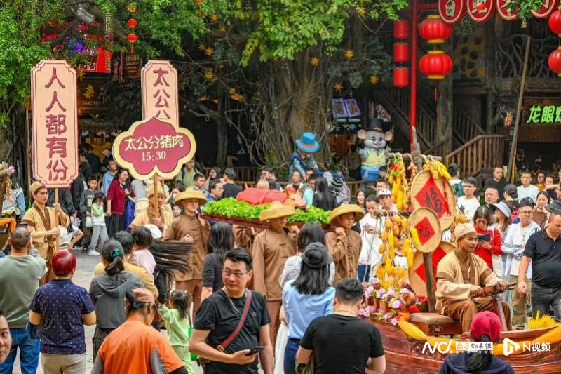假期中,佛山长鹿旅游休博园重现“清明太公分猪肉”场景。据介绍,“清明太公分猪肉”起源于明清时期,流行于南方珠三角和香港等地,承载着中国传统民俗文化。活动当天,过万名游客欣然参与,共享“福肉”。锣鼓喧天中,身着古代樵夫服饰的巡游队伍,肩挑沉甸甸、香气四溢的大烧猪与满溢的米酒罐,在园区巡游。厨师娴熟地分发烧肉,游客们排着长龙,兴高采烈地接过这份饱含传统韵味的舌尖美味。