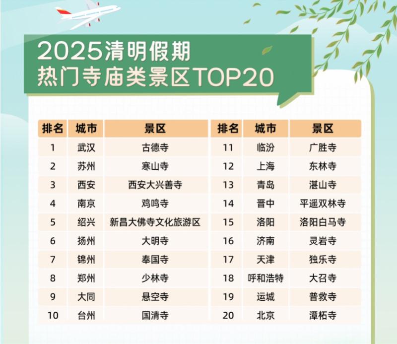 同程旅行平台数据显示,清明假期期间全国各地知名寺庙类景区人气较日常均值上升了200%以上。其中,人气较高的寺庙类景区主要有:武汉古德寺、苏州寒山寺、西安大兴善寺、南京鸡鸣寺、绍兴新昌大佛寺、扬州大明寺、锦州奉国寺、郑州少林寺、大同悬空寺、台州国清寺等。热门寺庙不仅有传承千百年的传统文化活动,同时还有各自的春季“镇寺名花”。例如,南京鸡鸣寺的樱花,扬州大明寺的山茶花,上海东林寺的樱花、桃花、海棠花,北京潭柘寺的玉兰花等等,在寺庙古建的映衬下显得非常“出片儿”。