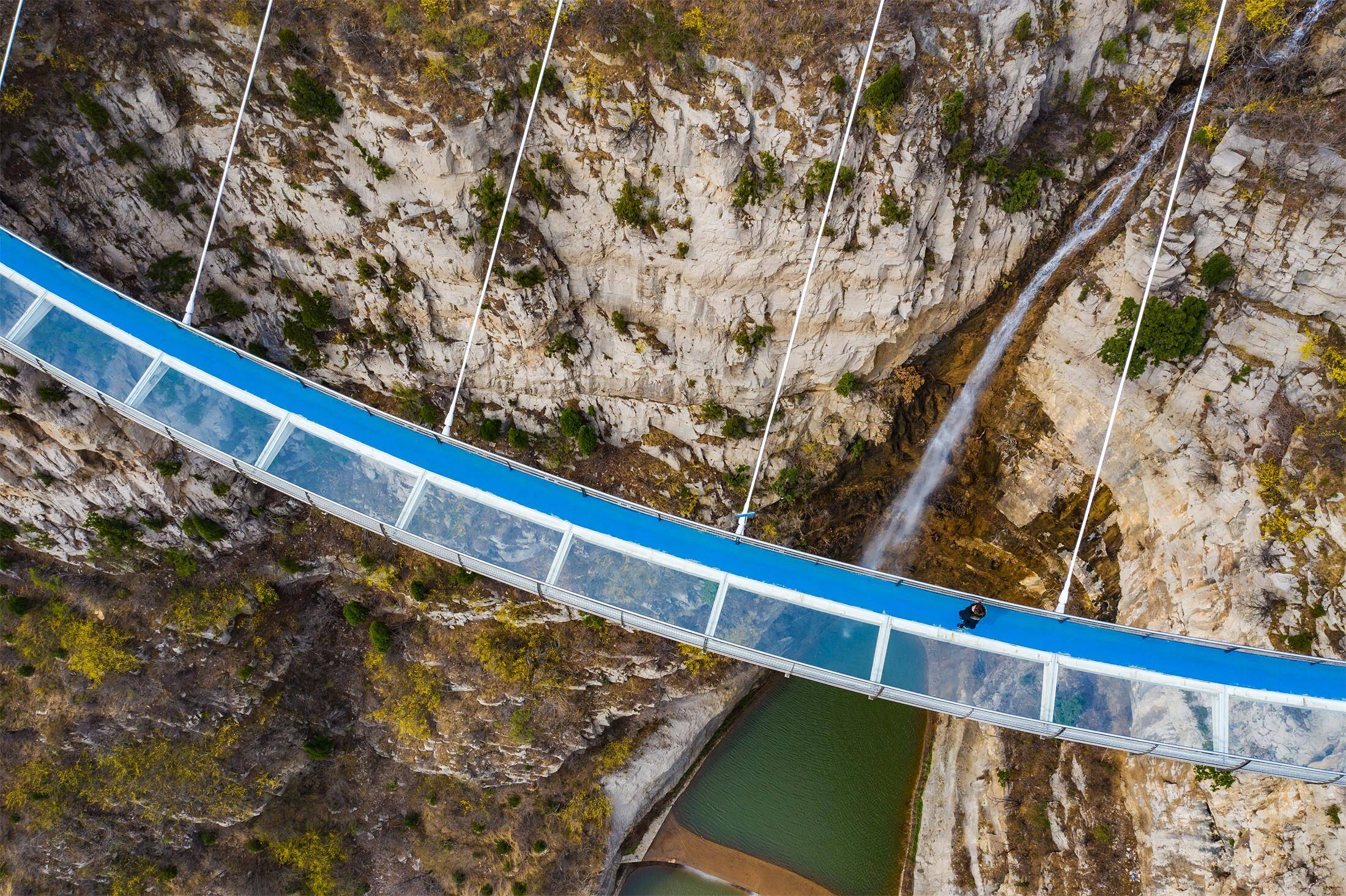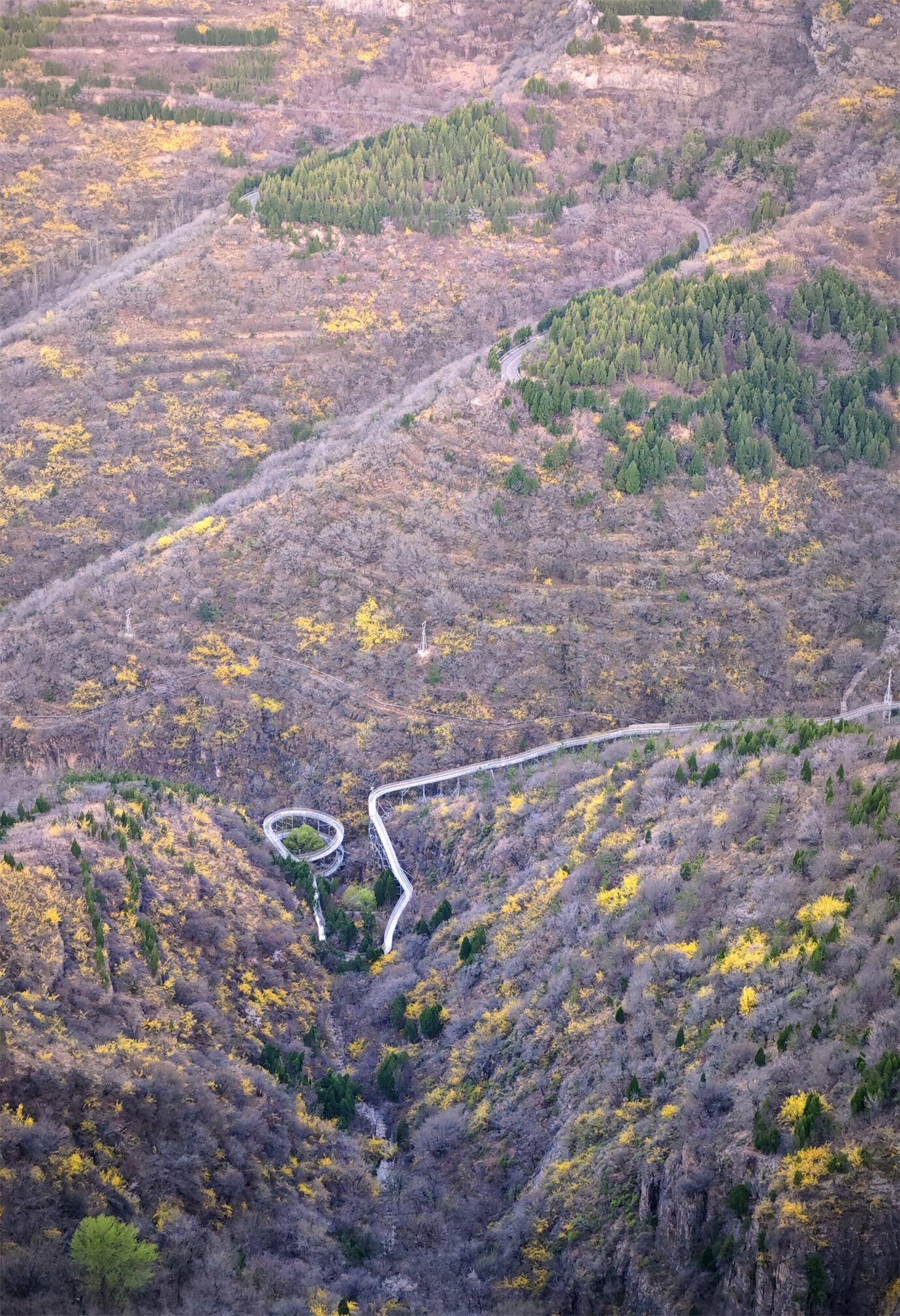 千亩连翘从山间倾泻而下,徒步于峡谷间近距离观赏,或登临高空玻璃桥俯瞰,山涧溪畔暗香浮动,步移景异的花路让游客流连忘返,宛如一幅美景与游人和谐共生的春日油画。