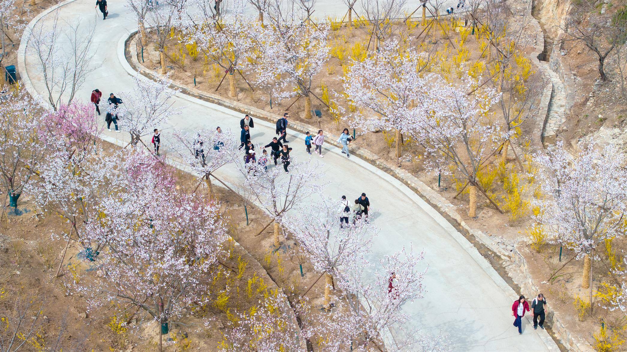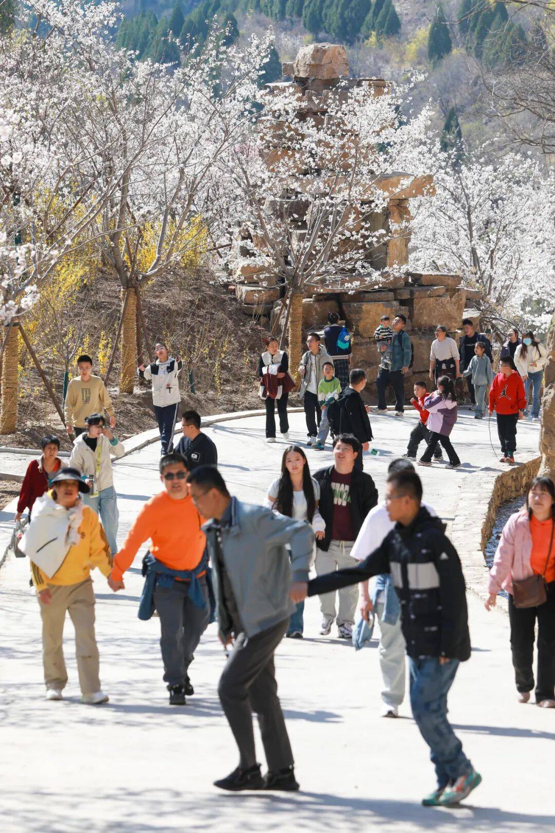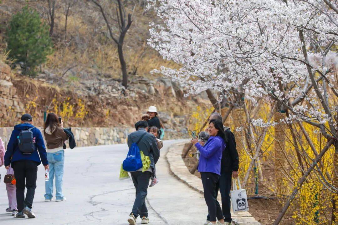 2000米峡谷樱花长廊迎来盛放,早樱摇曳枝头,如白色云雾缭绕山间。其间点缀金黄连翘,樱花谷化身“大自然的调色盘”。游客穿行其间,身临其境感受春日气息。