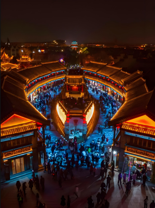 船型街位于台儿庄古城景区内核心位置,是运河文化的标志性建筑,四周环水,形似扬帆起航的巨船,寓有“大河行舟,一帆风顺”之意。灯光亮起后,绚丽的灯光秀和古建筑完美融合,整个船型街沉浸在光影的海洋中,化身为“运河之眼”。运河潮起,一眼千年。船形街的二楼是中国运河招幌博物馆,展陈明清及民国时期的各式招幌500余件、招徕市声60余种,再现了当年运河沿线地区绚丽多姿的商业文化风情。