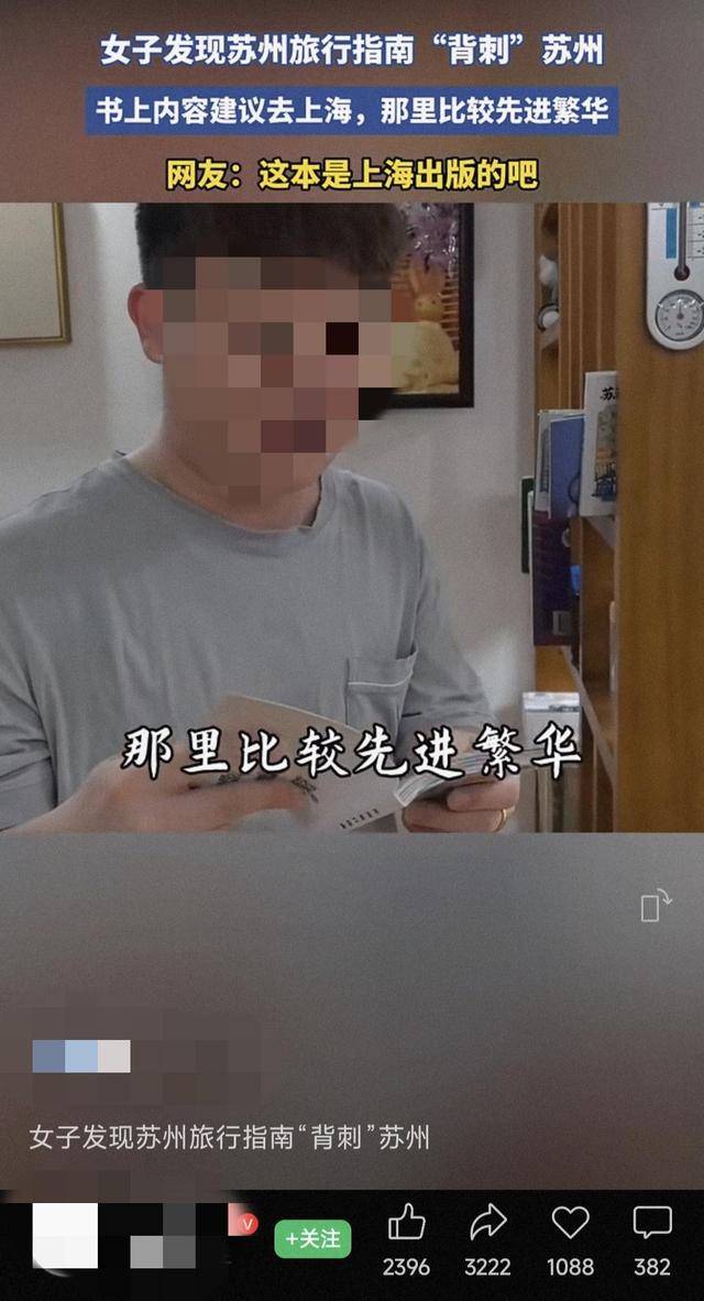现代快报讯(记者 高达 文/摄)日前,有媒体发布的一则微信号视频引发热议。视频中,一男子拿起书架上的一本《苏州旅行指南》,并在翻开后做念出其中内容状,说道:“建议你去苏州北站,乘G103到上海,那里比较先进繁华。”随后画面外一女子笑着表示此举为“背刺苏州”。