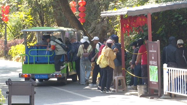 景区电瓶车乘坐点已排起长队,许多游客对改造后的索道充满了期待。