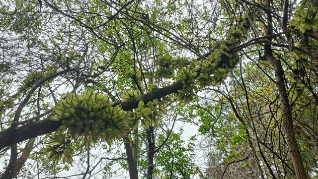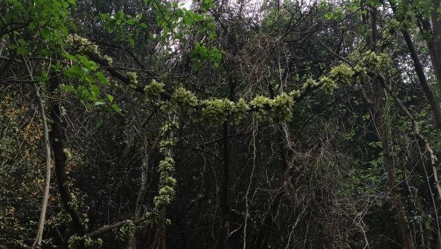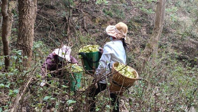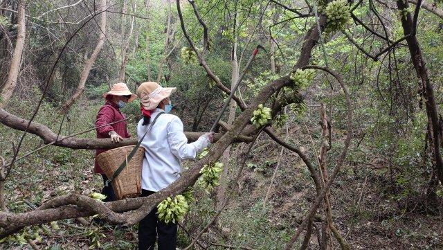 中午时分,洛河乡妇女白翠玲与姐妹白会芬、高僡伽挎着竹篓走进山林。密林里,几棵树间垂落着一片花的“瀑布”,穿行其间,阳光穿透花瓣,在地面投下斑驳的“雀影”。“这是禾雀花,我们又叫它‘老鸹花’,春风吹到处,这种花就从山顶到山脚顺序开放,花期有1个月左右,可持续到清明前后。”白翠玲说。