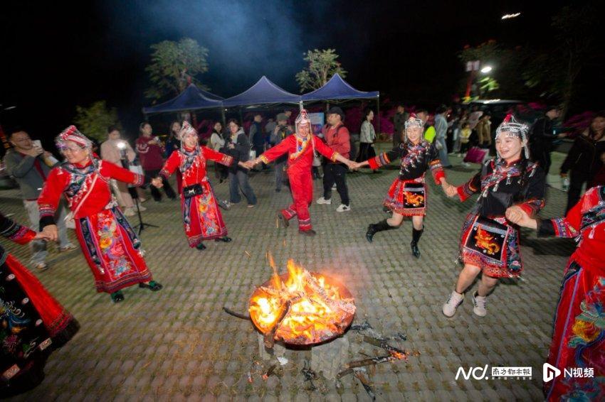 傍晚,依山而设的畲族长桌宴以乌米饭、畲家美食佳肴款待宾客。夜幕降临后,篝火晚会点燃激情,游客与畲族同胞携手起舞,火光映照下的角峰村化作欢乐的海洋。