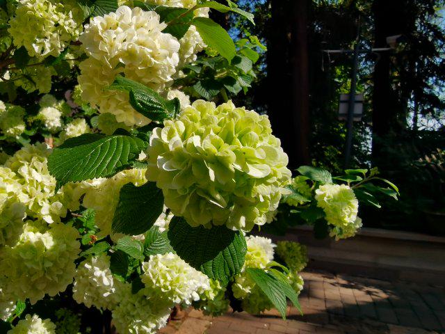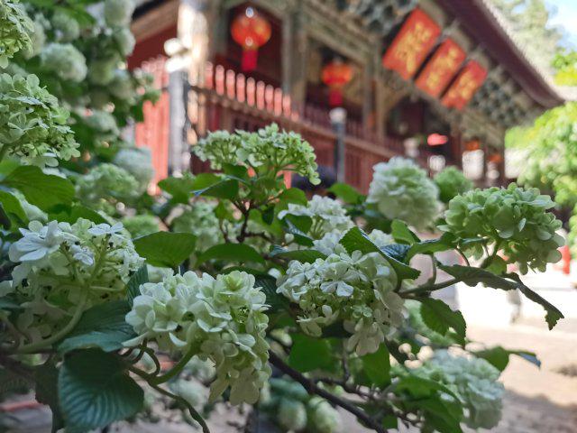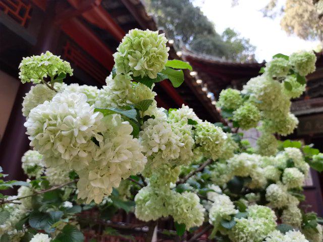 漫步至玉皇阁红云殿,只见枝头木绣球团团锦簇,如皑皑雪球缀满枝丫。绿白交织间,传递出一种宁静致远的悠然意境。木绣球初绽时嫩绿鲜翠,随后渐渐过渡为淡雅的乳白,直至化作纯净洁白,整个花期长达一个月,将时光都浸染得温柔缱绻。庭院中,一株株木绣球错落有致,与新绿的叶片相互映衬,在热闹中沉淀着远离喧嚣的静谧。游客们穿梭于雕梁画栋间,用镜头定格下花影摇曳的浪漫。
