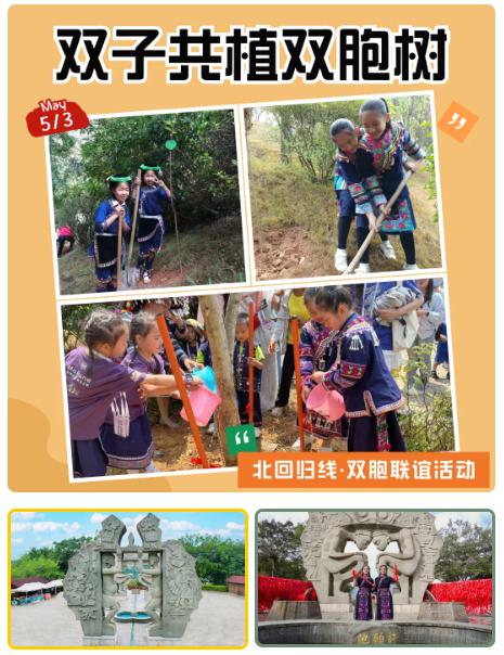 走进双胞林,与50对双胞胎一同挂同心锁,写下心愿封存,来年见证惊喜;朝觐双胞井后,在双子星广场,亲手种下象征热带、温带的双子树,留下专属印记!