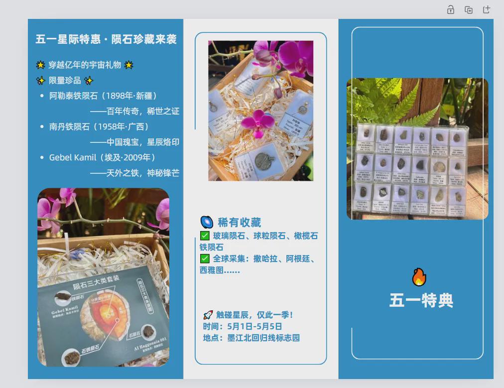 这个“五一”,来房车营地文创市集,触摸陨石的神秘,感受手作的温度,赢取未知的惊喜,收获独一无二的假日体验!