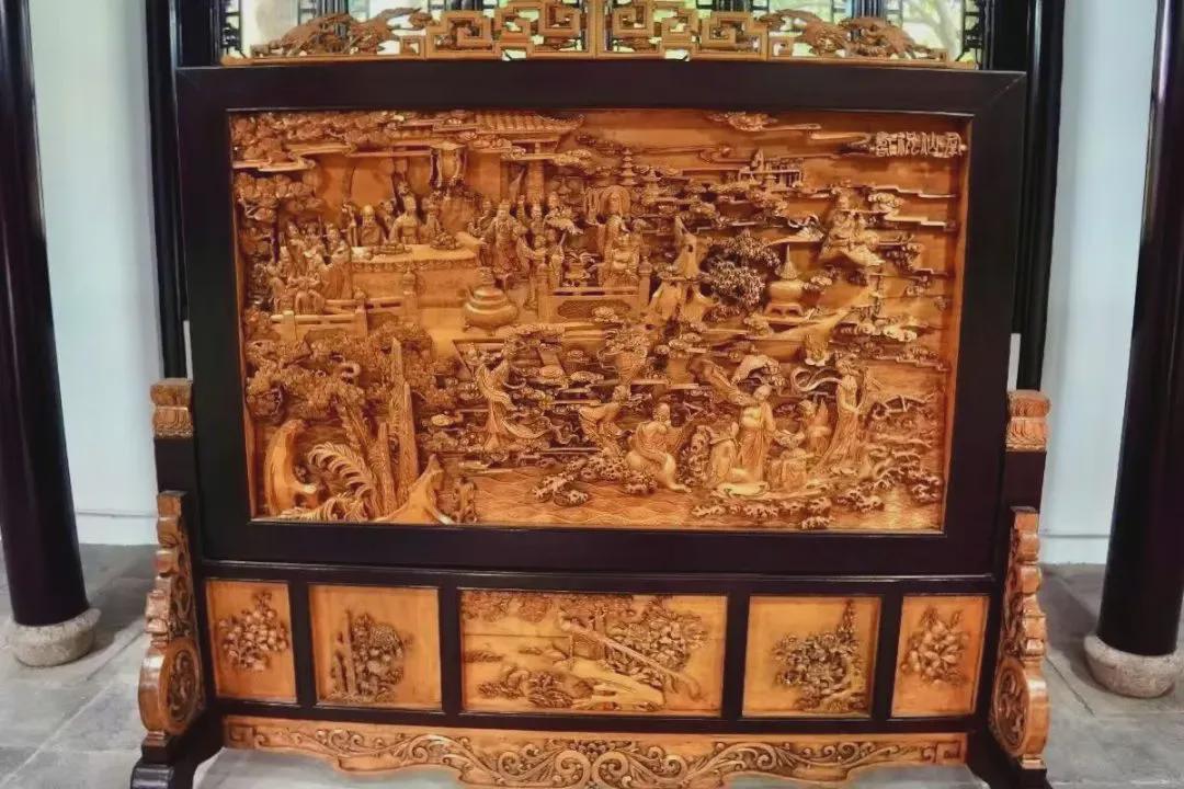 在修葺一新的雕花厅前,匾额“雕花厅”三个字气韵流畅,落款为松江已故著名画家吴玉梅。两侧楹联上联“厅窗雕像厢窗雕像雕成整套三国像”,下联“门楣镂花梁枋镂花镂出千姿百态花”,概括了雕花厅内容及特色。走进前厅,迎面就是一幅硕大的木雕屏风,上面雕满了密集的花卉,醉白池公园管理方介绍,这样的屏风共有4件,与8幅墙上壁画分别置于前厅、两侧厢房和正厅内,均为椴木,是浙江东阳雕刻师上世纪80年代末纯手工雕刻的。