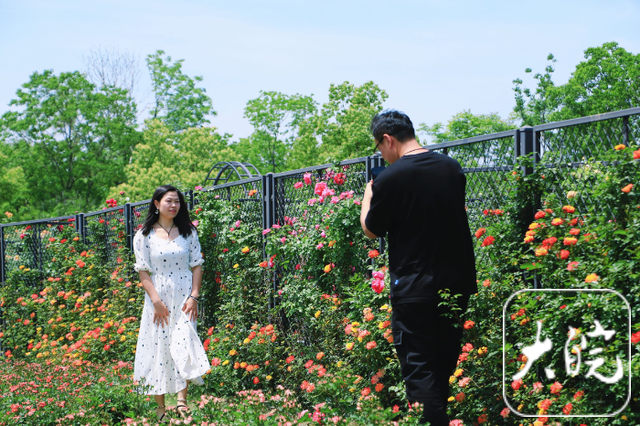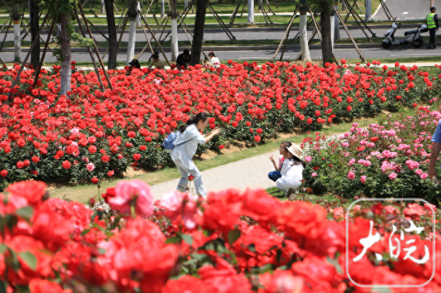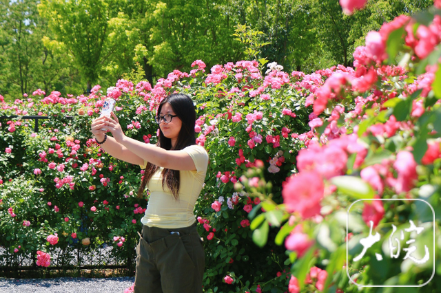 游客在月季园拍照打卡