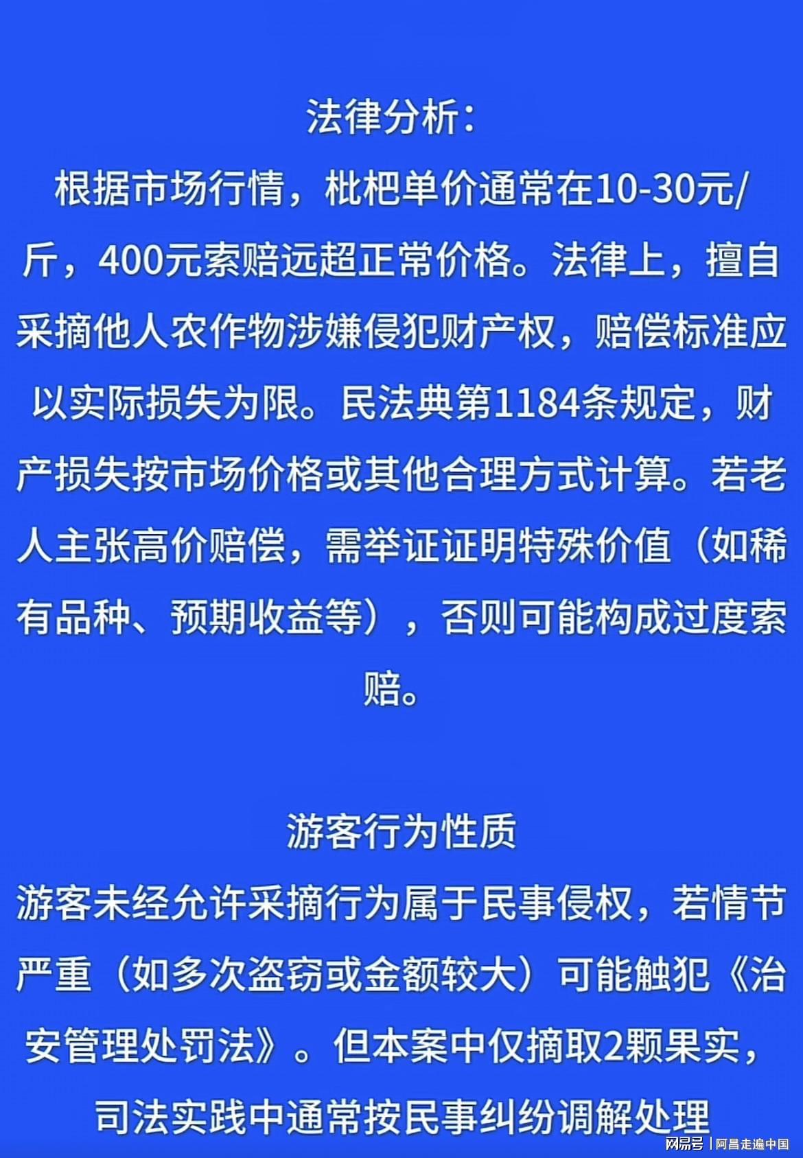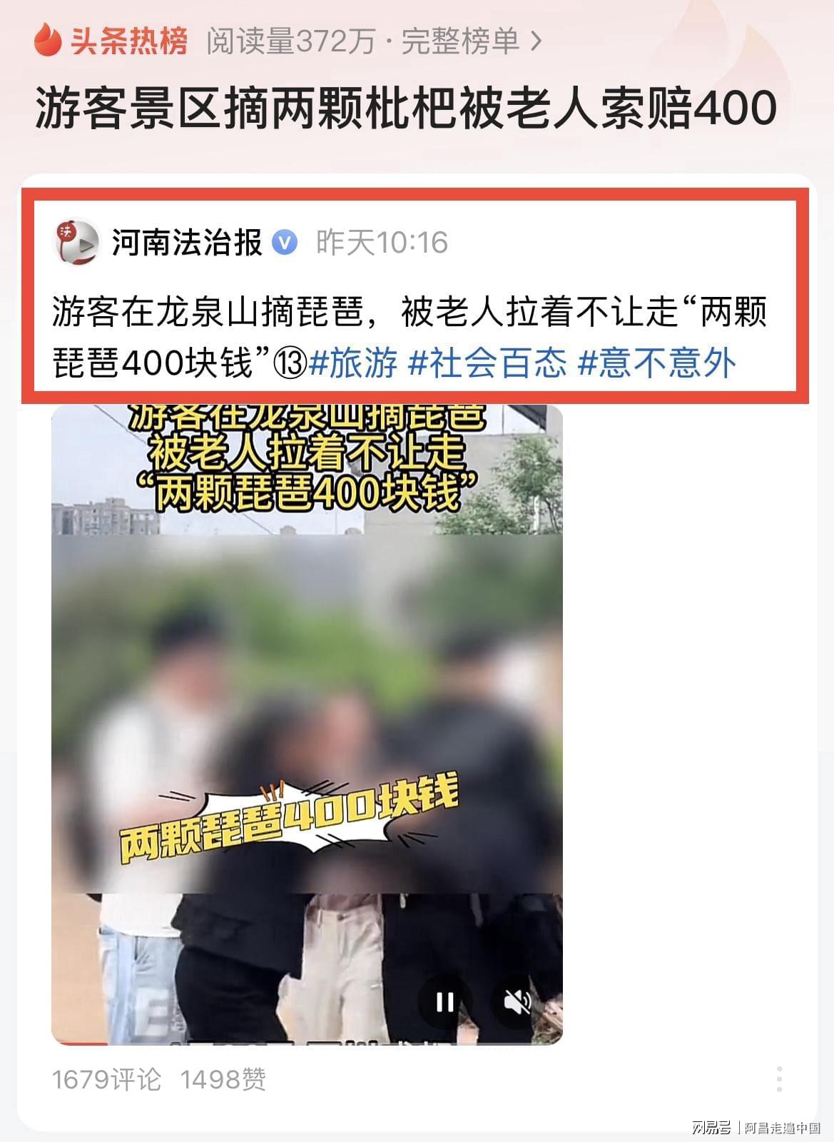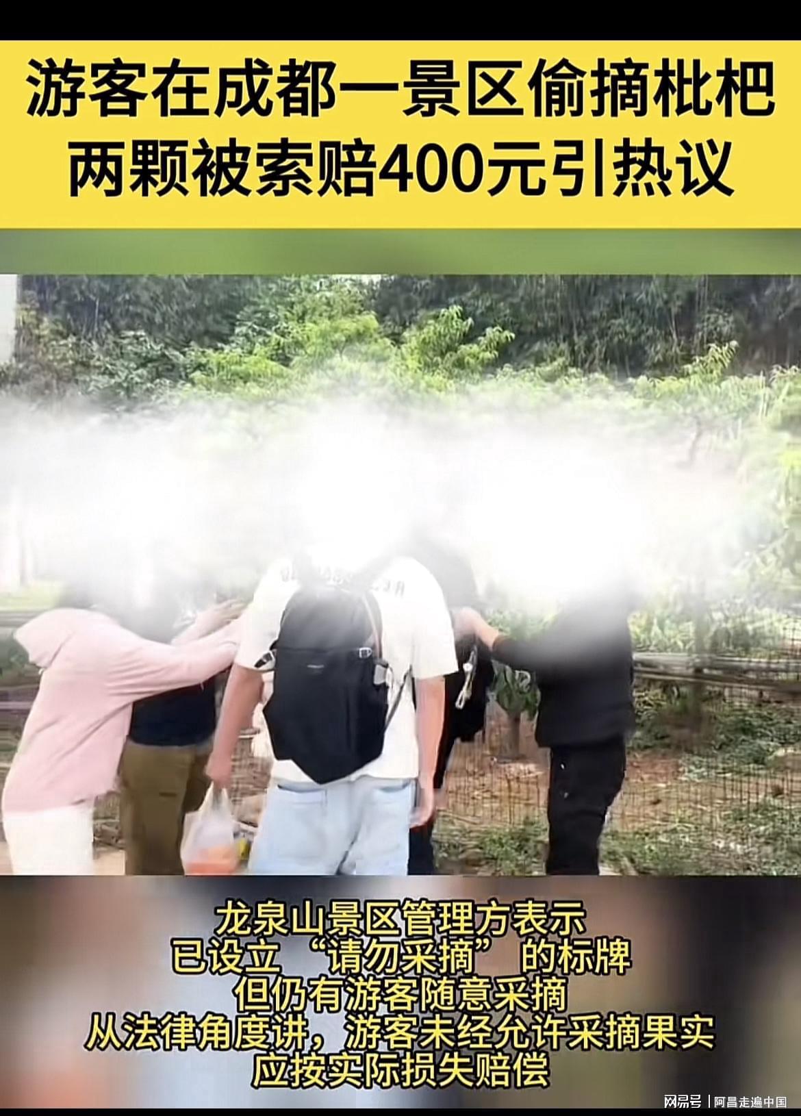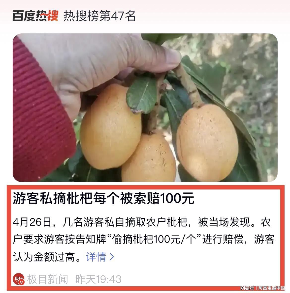 到一个地方旅游,必须要尊重当地入乡随俗,没有得到他人允许,不要轻易私拿别人东西,这个两个枇杷索赔400元,让我想起了2023年河北涞水县,两个核桃向游客索赔3000元的事情,这也是一个活灵灵的教训,五一假期给广大游客提个醒,万一遇到不讲理游客往地上一躺,讹诈你咋办呢。