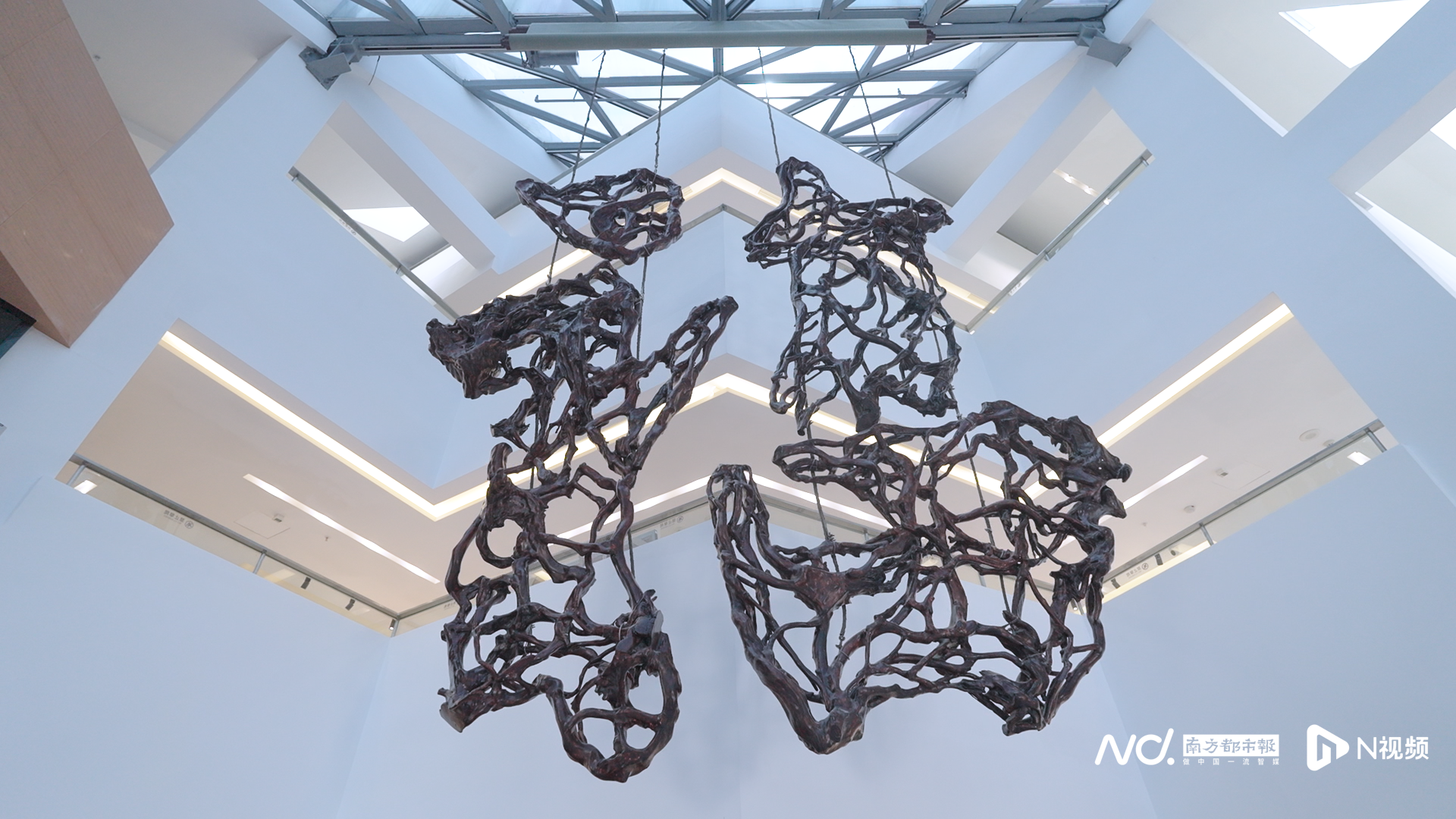 你看阳光透过艺术馆玻璃穹顶,落在根书作品巨大的“福”字上,似乎在诉说木与墨的千年私语。