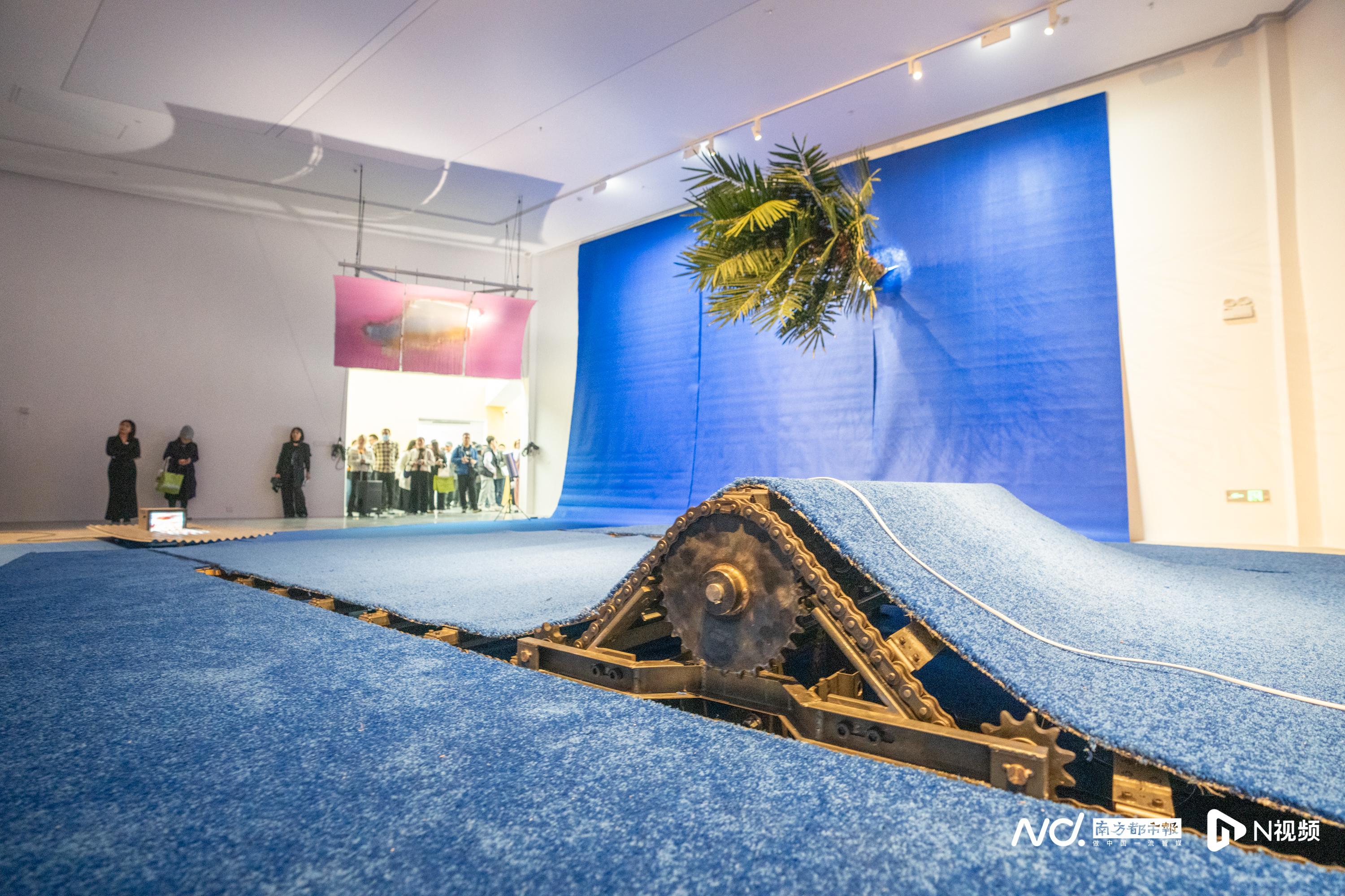 多里安·高迪的作品《无限场域》正在展出,在这里,一棵树从回廊展厅破土而出,突破了建筑墙面和蓝色幕布试图观赏另一边的风景,我们似乎习惯了对自然的占领和改造,忘记了自然也曾是我们的家园。