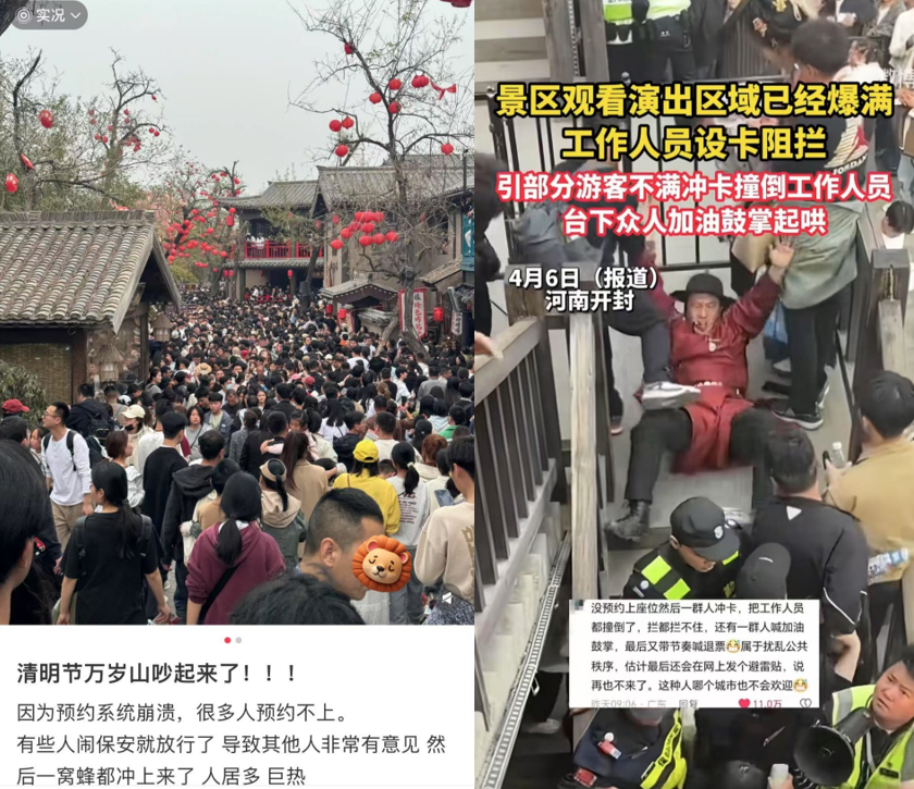 当时,热门演出《三打祝家庄》因预约系统崩溃,现场游客无法入场,入口处上千人齐声喊“退票”,场面混乱。