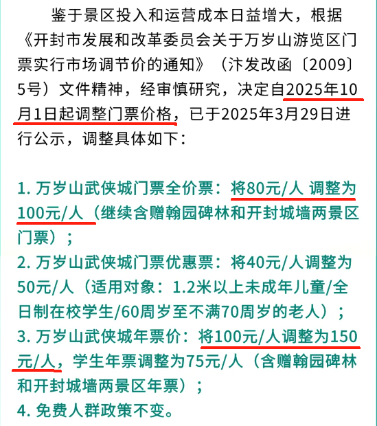 从10月1日起,万岁山武侠城的全价门票从80元涨到了100元,年卡价格也从100元上涨至150元。