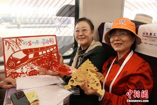 山东老年大学学员带着手工创作的剪纸作品乘车。赵晓 摄