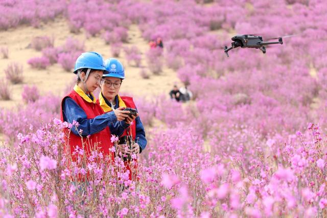 4月28日,在扎兰屯市中和镇架子山村杜鹃坡,国网扎兰屯输变电工区志愿者对电力线路进行巡检。摄影 韩颖群