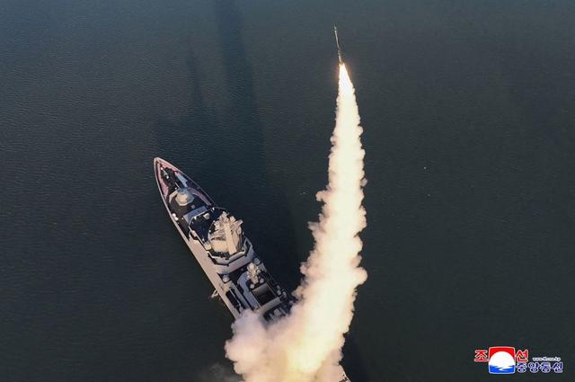 朝鲜新型驱逐舰“崔贤”号进行武器试射。
