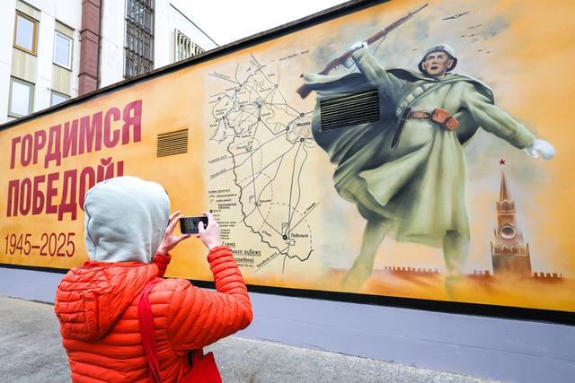 一市民在拍摄纪念卫国战争胜利八十周年的纪念画。