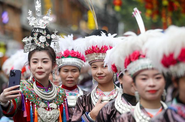 身穿民族服饰的游客与侗族群众合影。新华社发(袁福洪摄)