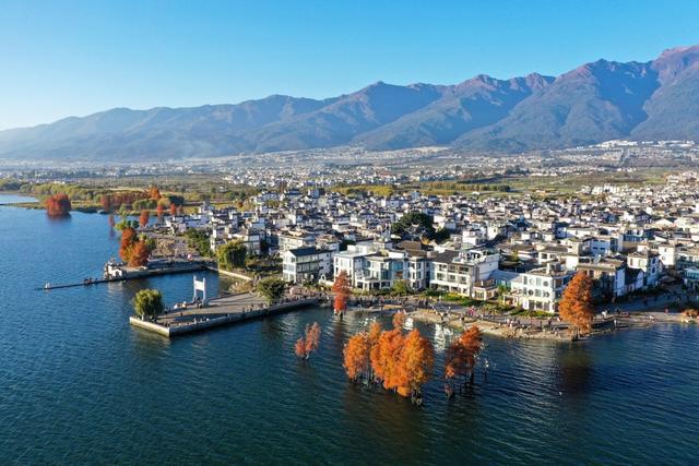 洱海畔的水杉红了,在暖阳映衬下分外艳丽。