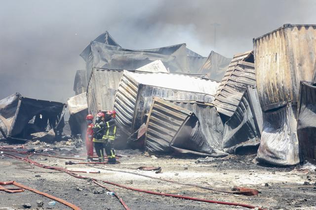 当地时间4月28日,沙希德拉贾伊港口的灭火工作仍在持续。