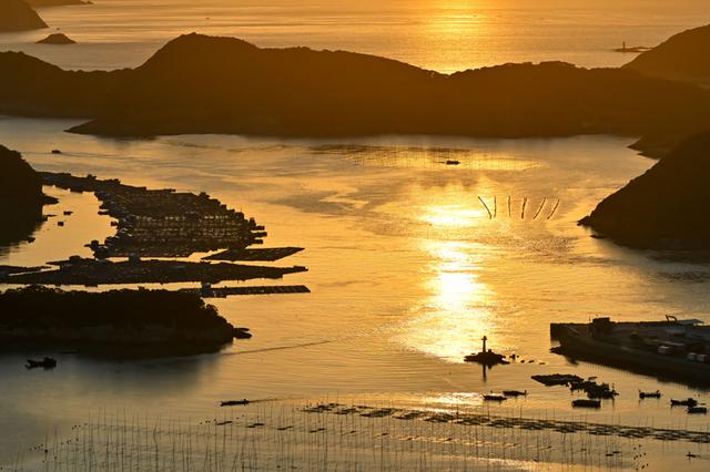滩涂上波光粼粼,如撒落的碎银闪烁。渔民们驾着小船穿梭,他们弯腰收割紫菜、整理渔网的身影,与滩涂的纹理相映成趣。夕阳西下,余晖将天空染成橙红色,滩涂披上一层暖金色的纱衣,每一幕都似天然雕琢的绝美瞬间,令人沉醉。
