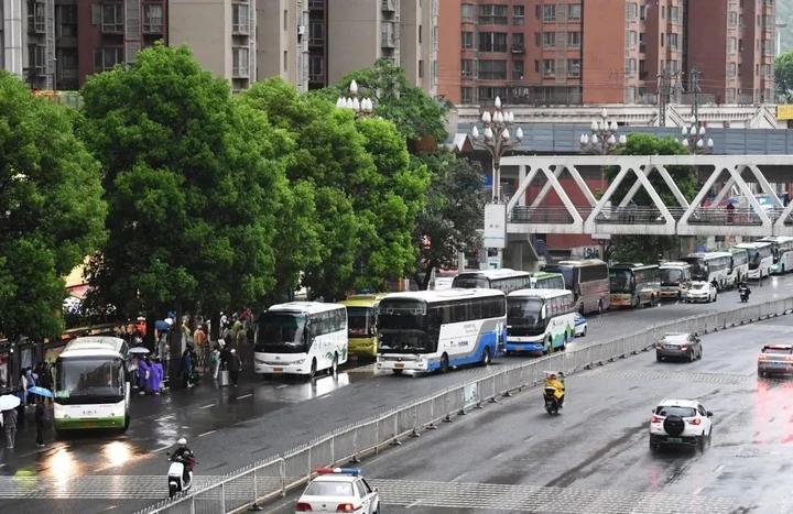 旅游大巴在南明区花果园满载游客准备前往全省各大景区。