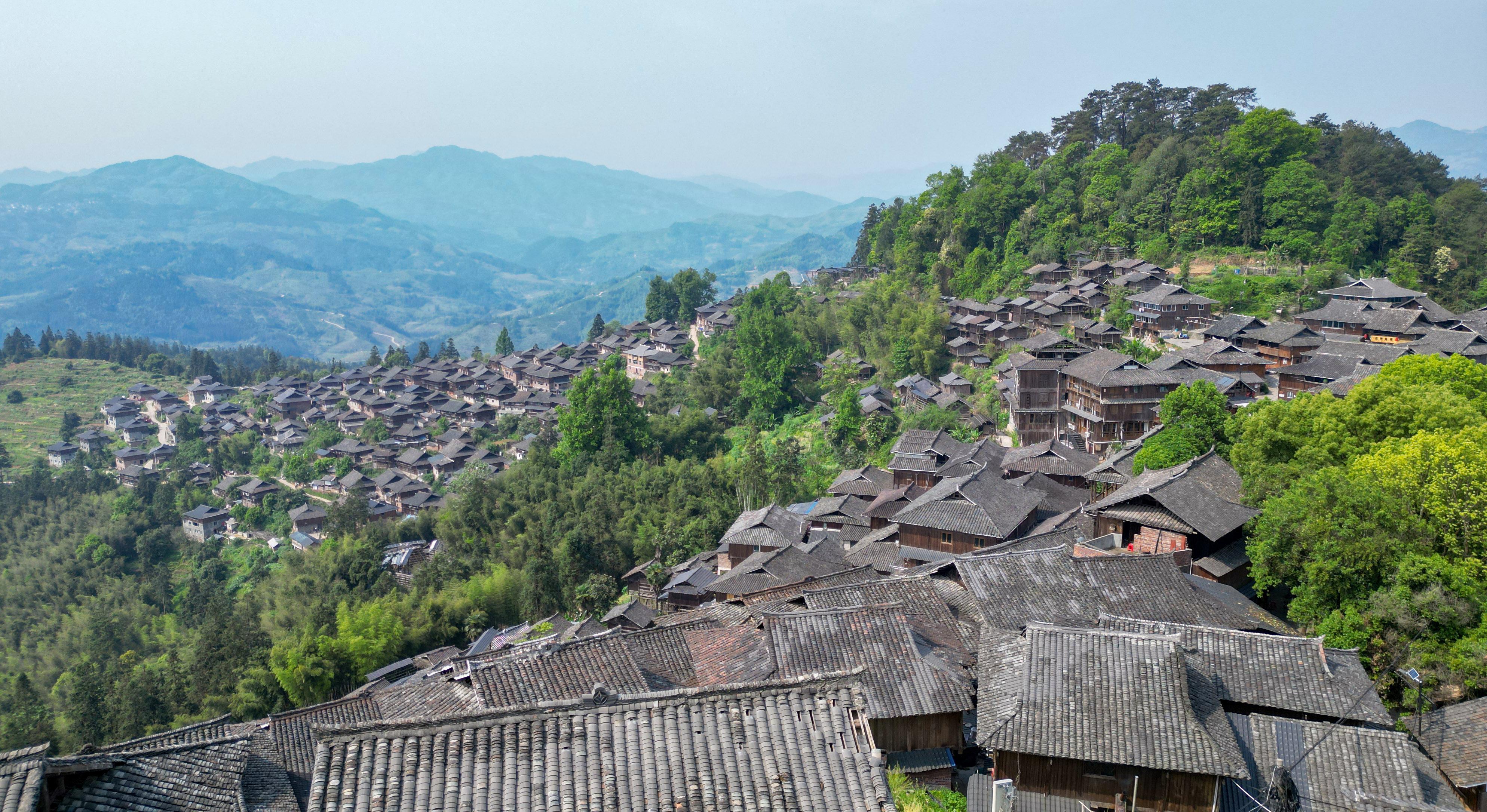 暮春时节,贵州省黔东南苗族侗族自治州从江县丙妹镇岜沙苗寨春意盎然,苗族特色建筑鳞次栉比,层层叠叠的梯田与苗族吊脚楼交相辉映,构成一幅和谐自然的田园画卷。