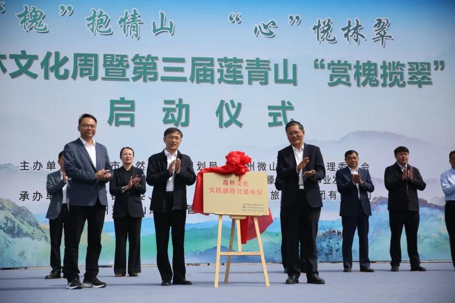 枣庄市自然资源和规划局党组成员、副局长宁方玉同志,滕州市林业事业发展中心党组书记、主任赵曰理同志,莲青山风景区管理有限公司董事长陈鹏军同志共同揭牌“森林文化实践创作共建单位”。