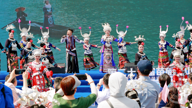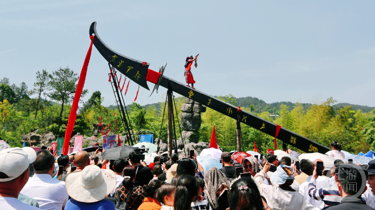 游客们不仅观赏到惊险的苗家绝技,还踊跃参与竹竿舞等互动环节,现场欢声笑语不断。
