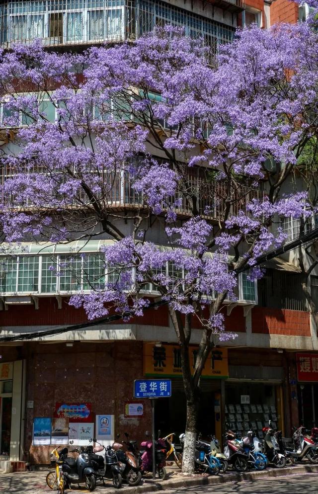 登华街完全可以作为蓝花楹的小众拍照地,超长的蓝花楹大道,人少车少、环境安静,随便停下,边走边拍,走到道路尽头右转到黄公东街,黄色的墙壁映衬着紫色蓝花楹,随手一拍都是景。