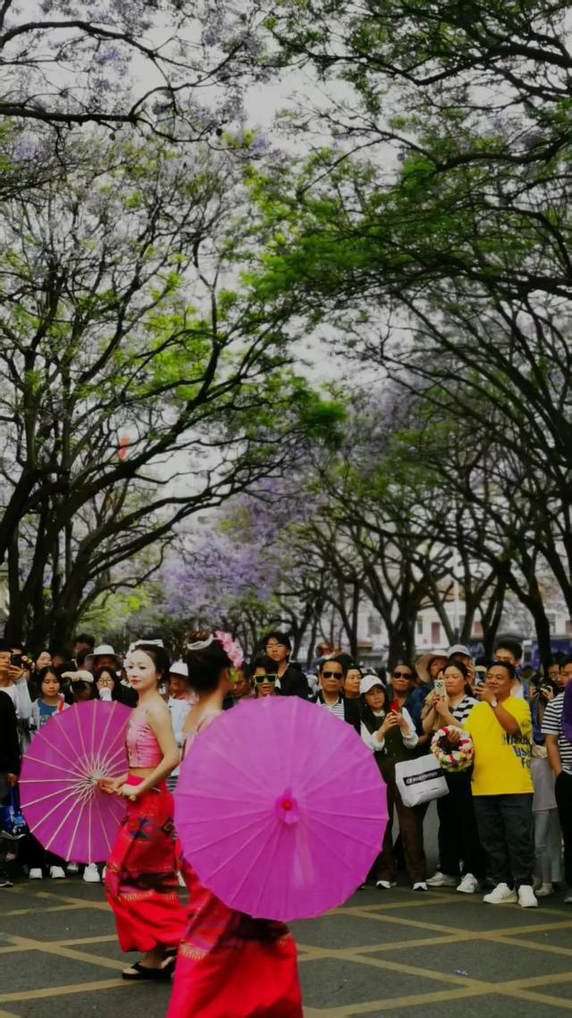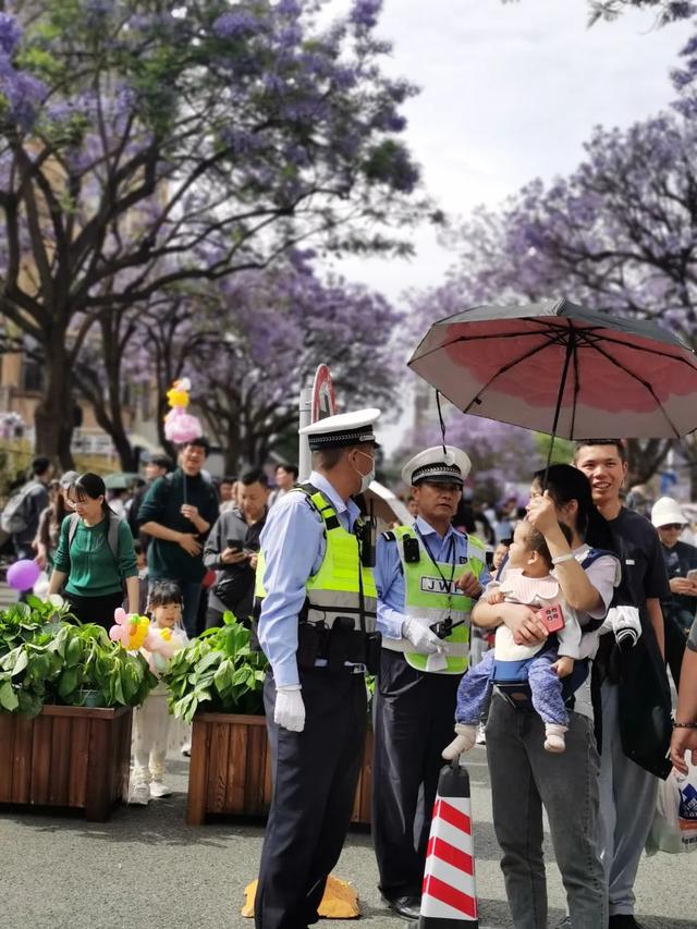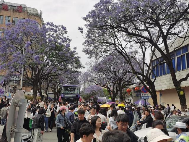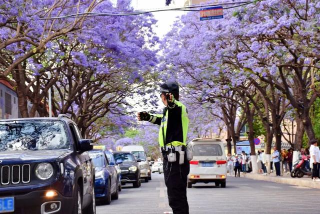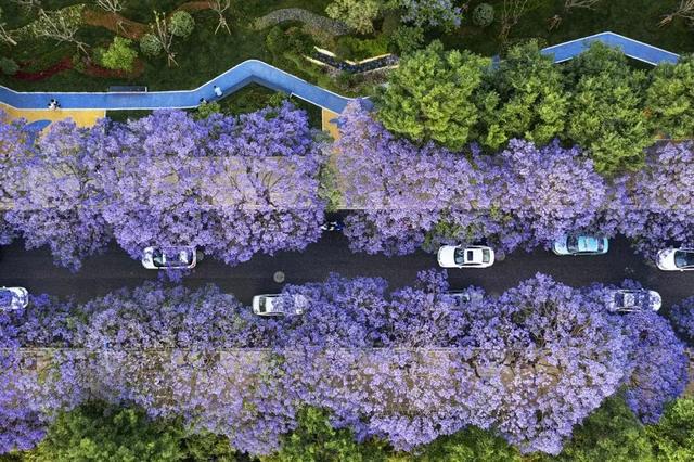 红锦路是昆明蓝花楹种植最多的地方,数量达上千株。花随风舞、热烈绚烂,正午的春城,万里无云,蔚蓝的天空下,红锦路连绵的花簇肆意绽放,繁花似锦。