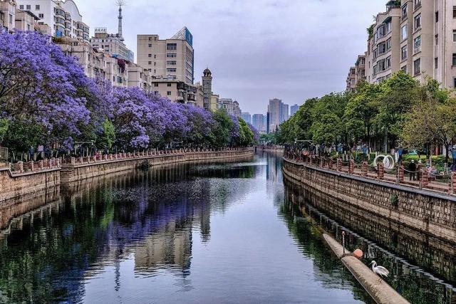 昆明“母亲河”盘龙江贯穿春城,千百年来流淌不息,孕育了异彩纷呈的春城文化,相伴一侧的蓝花楹成为盘龙江的限定式浪漫。
