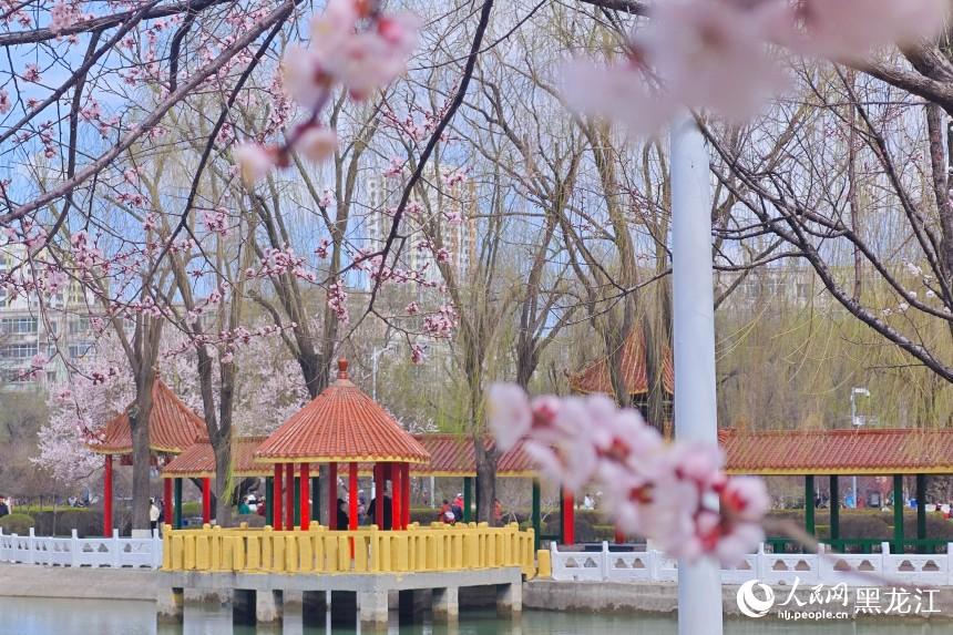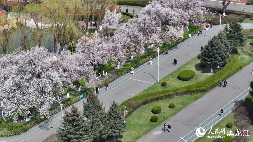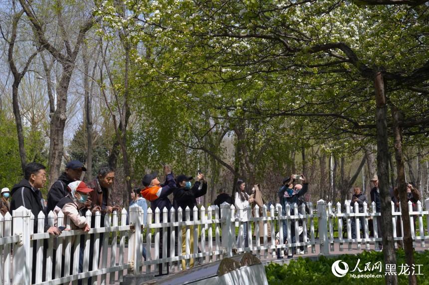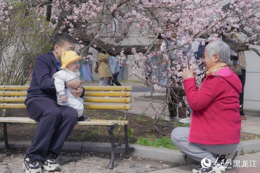 花树下,身着春装的游人或举着“长枪短炮”专注拍摄,或身着春季的服饰与花同舞,孩童追逐飘落的花瓣,老人倚着长椅闲话家常。游人的欢声笑语与满树繁花“同框”,成为哈尔滨的春日限定风景。