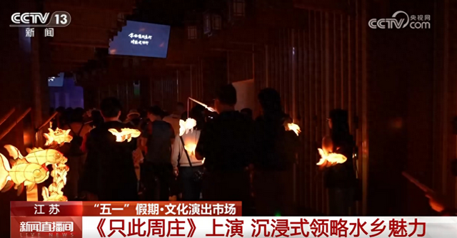 “五一”假期,水乡周庄精心打造的行浸式多维空间剧《只此周庄》上演,吸引了众多游客。现场观众手提一盏盏鱼灯一起逐光而行,走进热闹繁华的生活图景。焕新回归的《只此周庄》沉浸式演出,在故事脉络不变的基础上,剧情变得更紧凑,增加了更多互动体验。3D虚拟空间、元宇宙场景搭建等高科技手法的运用强化了视觉呈现。游客仿佛一瞬间穿越回了宋朝,走入了一幅幅宋代市井生活画卷,让“看戏人”成为“入戏者”,在沉浸式体验中感受千年水乡文化。