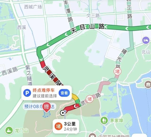 早上8点不到,手机地图软件显示,进出景区的灵溪隧道、灵隐支路已经堵成了红色,页面还发出了“终点难停车”的提醒。