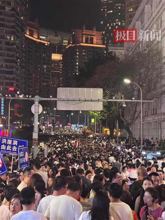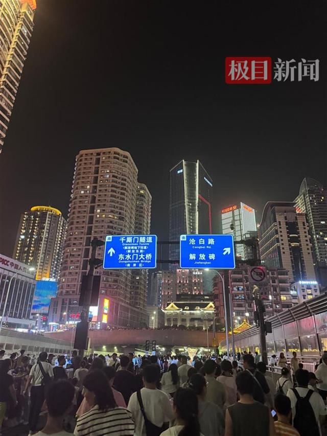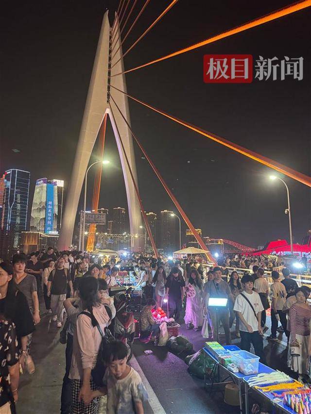 地图上显示,洪崖洞周边道路拥堵成深红色,多个方向的路段封路,无法直达洪崖洞,只能选择步行。抵达后,记者在洪崖洞景区附近看到,重庆实力宠粉,周边的封闭道路成为了游客的人行道,原本连接渝中区和江北区的千厮门嘉陵江大桥双向封闭,成了步行街,还摆上了美食摊,供游客们散步休闲打卡拍照。