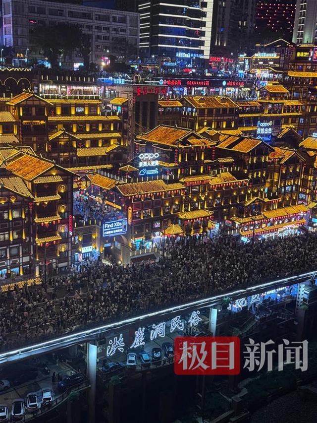 5月2日,五一长假第二日,重庆市网红景区洪崖洞依旧火爆。当天傍晚,极目新闻记者从5公里外的南岸区打车前往渝中区的洪崖洞景区,需要耗时50分钟。