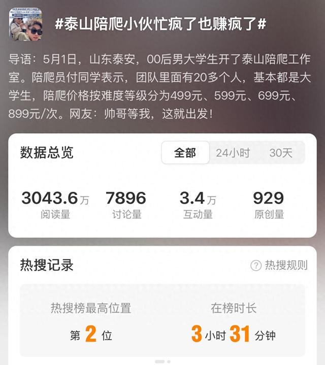 这个五一假期,#泰山陪爬小伙忙疯了也赚疯了#登上微博热搜。