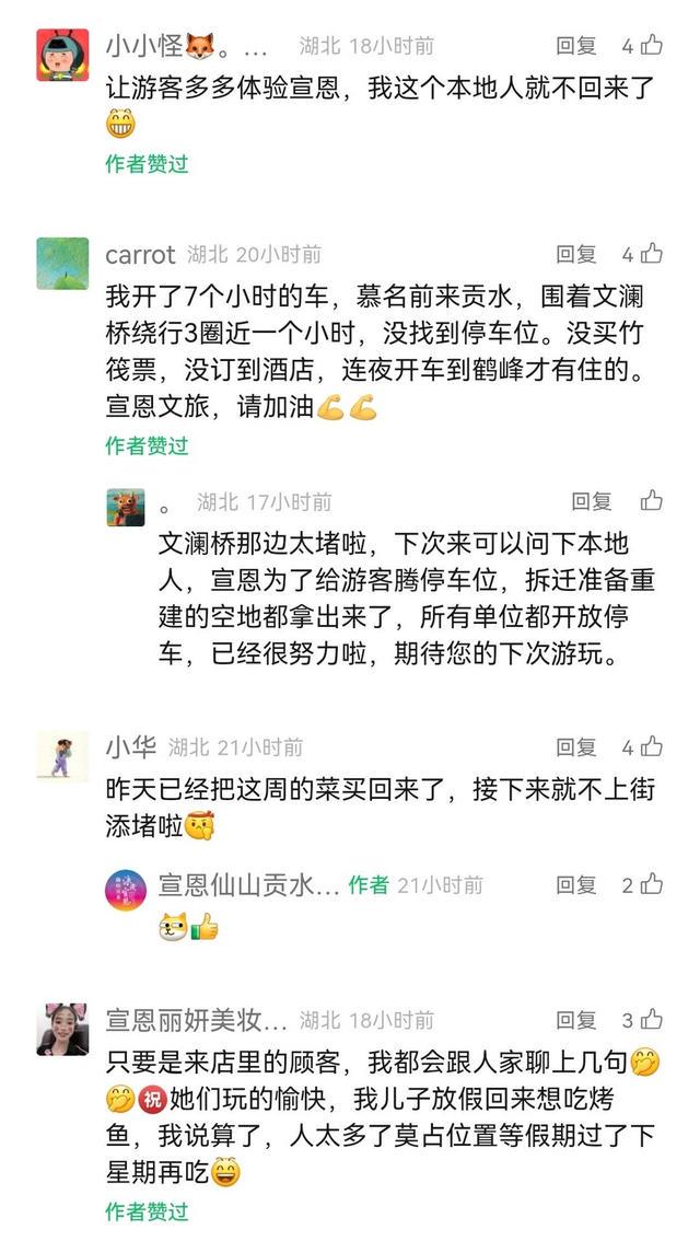 5月3日,“仙山贡水”景区公众号发布“客为先,礼让行”的倡议,倡导宣恩市民将热门体验项目优先留给游客,倡导市民优先使用公共交通,倡导市民主动给游客推荐靠谱的美食。有当地市民留言呼应倡议:已经提前买了一周的菜,争取不上街;儿子放假想回店里吃烤鱼,我让他算了,别回来占位置,等假期过了再回来;让游客多体验宣恩,我这个本地人就不回来了。