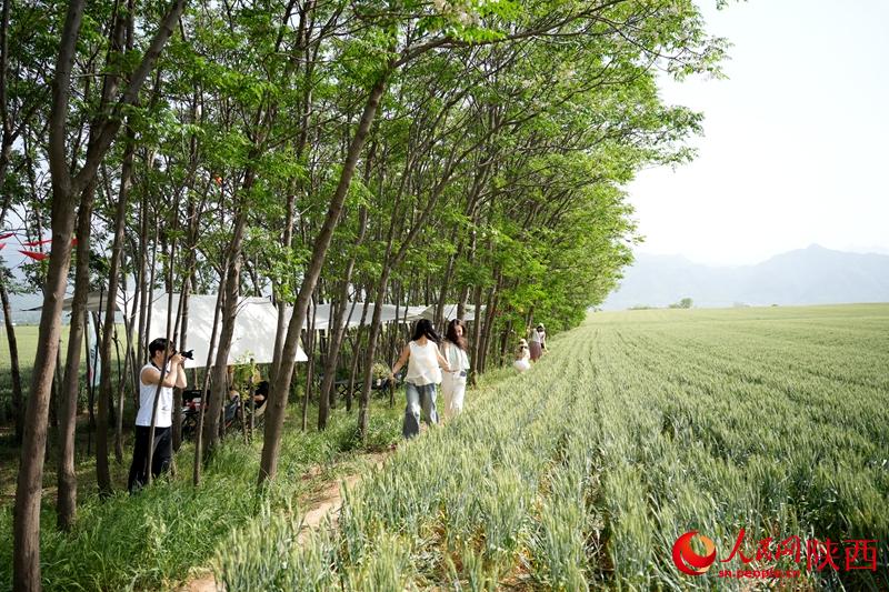 游客在长安区中江兆村麦田旁拍照。人民网 吴德锋摄