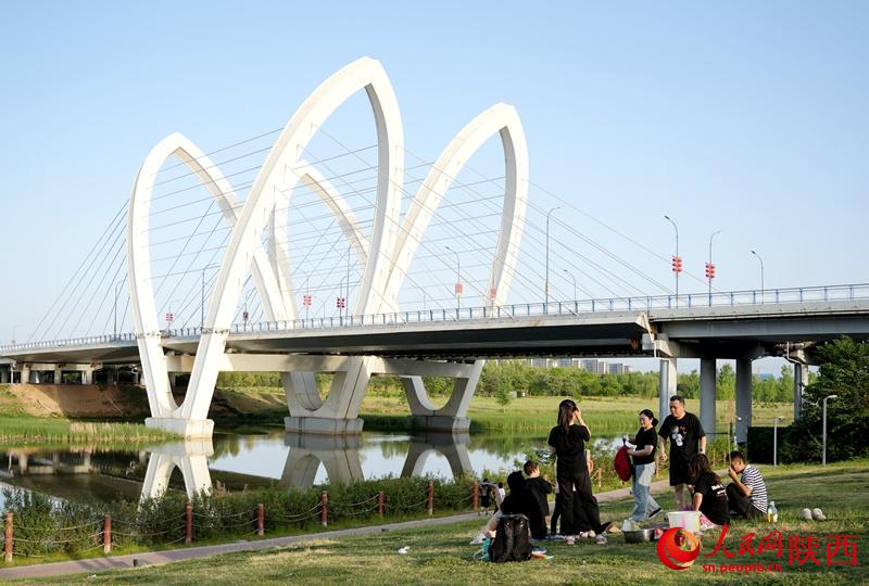 游客在沣河生态湿地公园玩耍。人民网 吴德锋摄