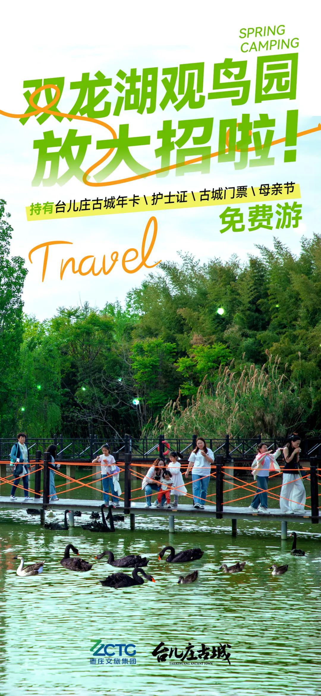 活动期间,全国游客购买台儿庄古城门票,即可凭票据免费游览双龙湖观鸟园!一票两景,超值解锁“古城人文+湿地生态”CP玩法。