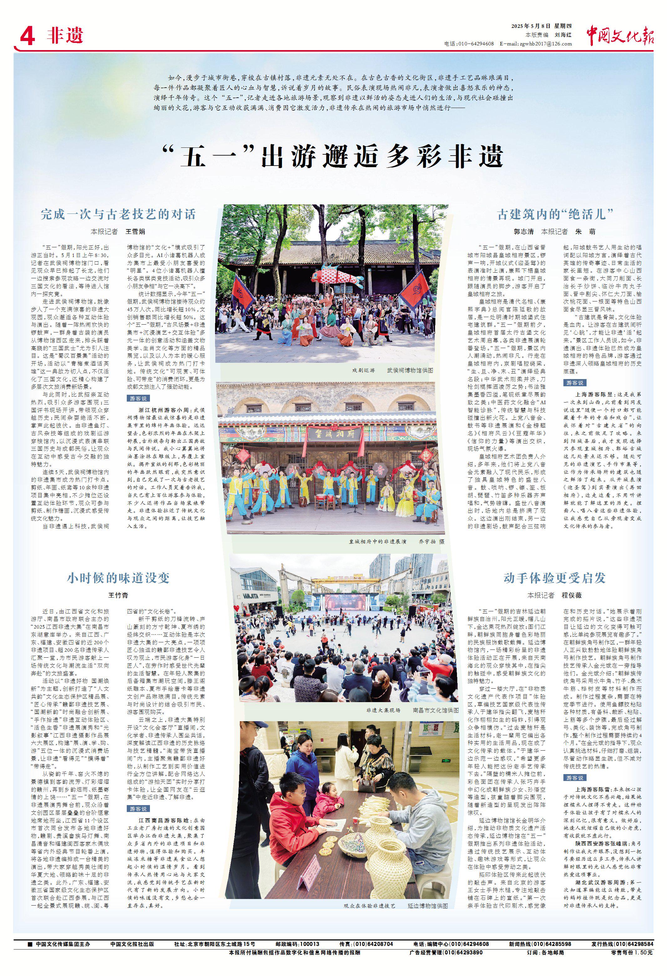 如今,漫步于城市街巷,穿梭在古镇村落,非遗元素无处不在。在古色古香的文化街区,非遗手工艺品琳琅满目,每一件作品都凝聚着匠人的心血与智慧,诉说着岁月的故事。民俗表演现场热闹非凡,表演者做出喜怒哀乐的神态,演绎千年传奇。这个 “五一”,记者走进各地旅游场景,观察到非遗以鲜活的姿态走进人们的生活,与现代社会碰撞出绚丽的火花,游客与它互动收获满满、消费因它激发活力,非遗传承在热闹的旅游市场中悄然进行——